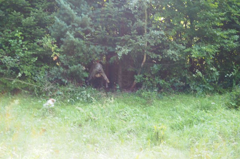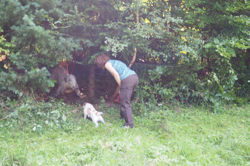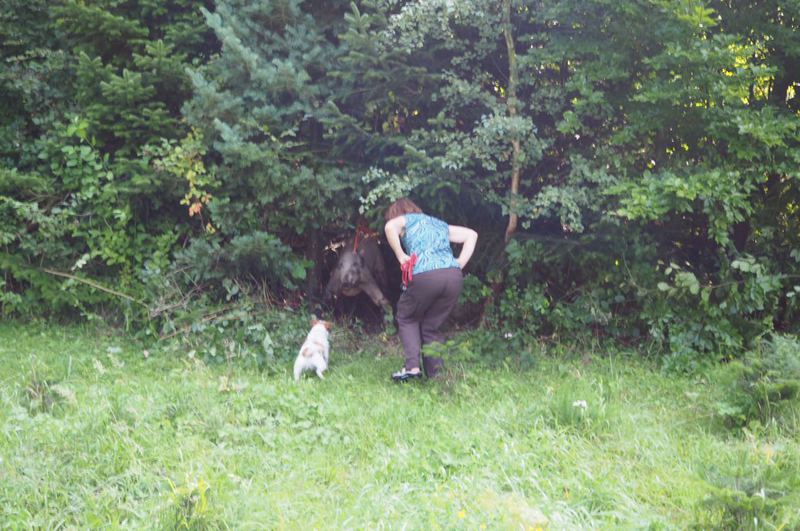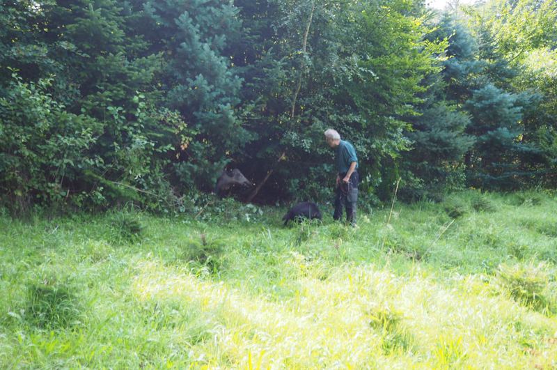 Auf großes Interesse stieß die angekündigte Pendelsau, die im Gebüsch installiert war und dann den suchenden Hund auf der Spur überraschte. Die Reaktion der Hunde begeisterte Hundeführer, Jäger und Interessierte. Je nach Rasse, Temperament und Erfahrung wurde die Pendelsau attackiert, verbellt oder ein größerer Abstand eingehalten. Ganz erfahrene Hunde machten sogar die Ursache für die Bewegung der Sau aus und quittierten dann ein deutliches Desinteresse an der Attrappe.