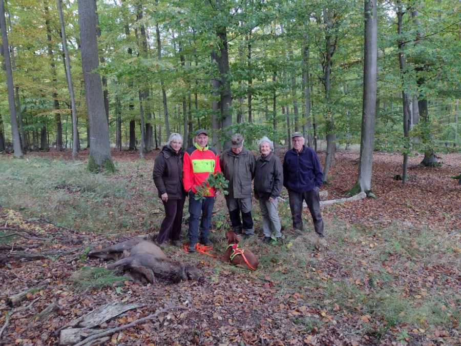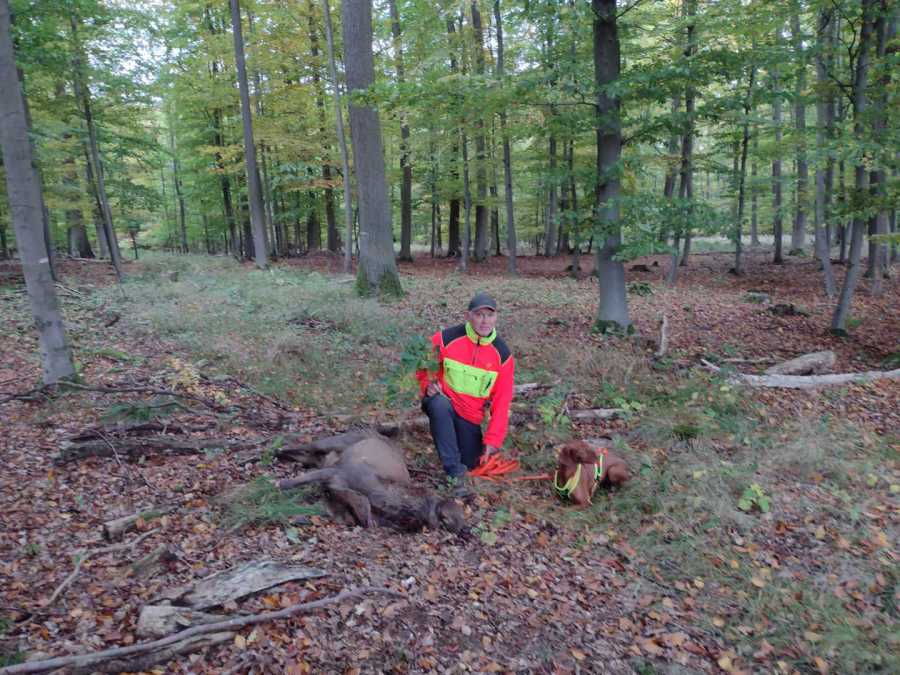 dabei die Schweißarbeit: Nach der rund 400 Meter langen Fährte konnte meine Hündin das Rotwildkalb sicher finden – ein beeindruckender Moment, der mir als Erstlingsführer noch lange in Erinnerung